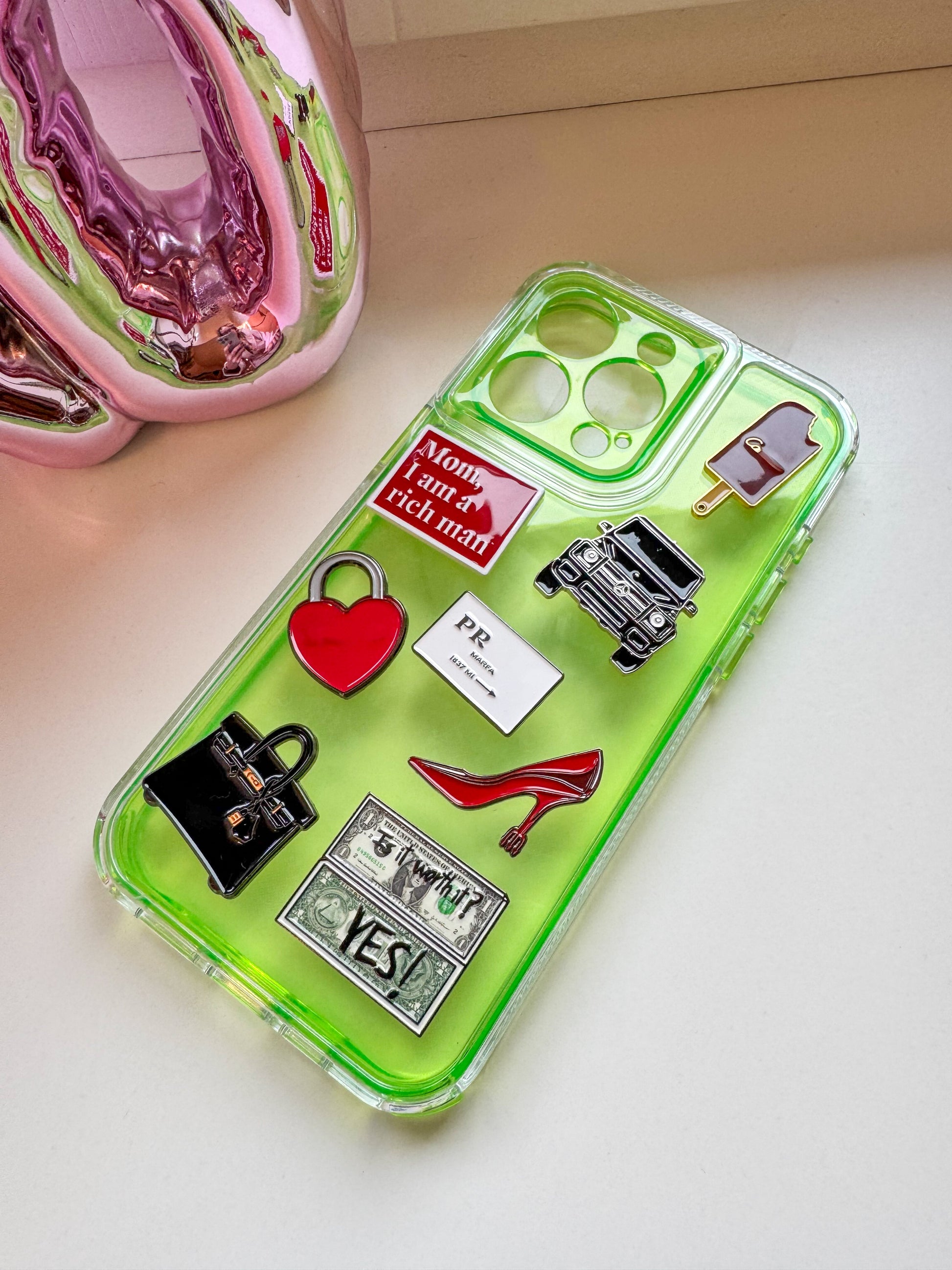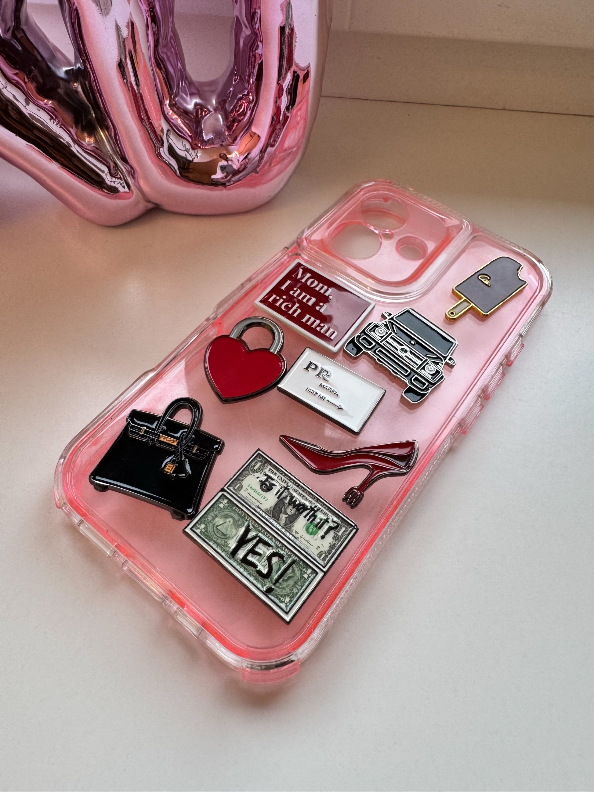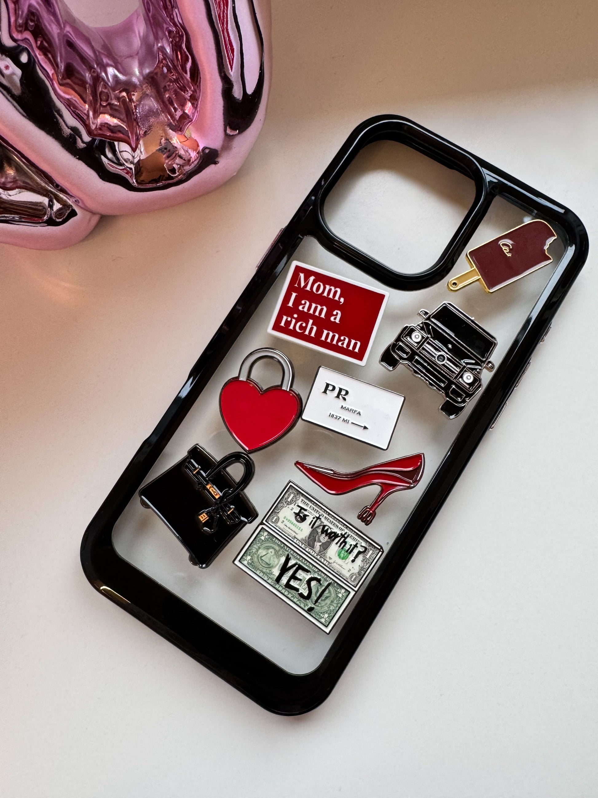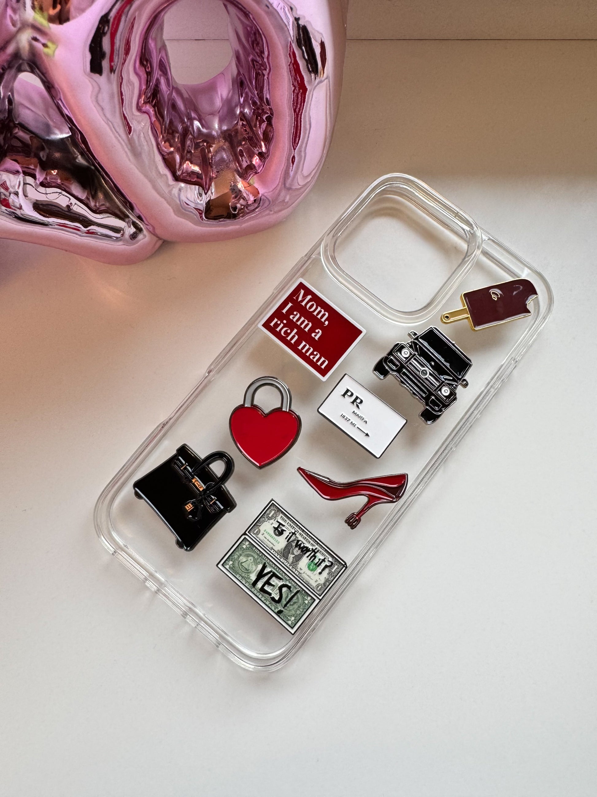 Jeder Charm ist aus robustem, emailliertem Metall gefertigt und besticht durch seinen glänzenden Look und die stilvollen Designs, die Luxus, Glamour und Popkultur vereinen. Dank der selbstklebenden Rückseite lassen sich die Charms mühelos anbringen und verleihen deiner Hülle in Sekunden einen individuellen, hochwertigen Touch.